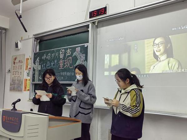 活动期间,七支由学生组成的队伍依次对影视片段进行配音表演。参与配音的同学们以扎实的表演功底、抑扬顿挫的声音和细腻真挚的情感给观众带来了深刻的体验,带领大家重新走进那一段革命岁月,重温先烈们不怕流血牺牲,克服千难万险,进行革命斗争的高尚事迹。其中,李昶、谷雨和林佳洋三位同学以《谍战深海之惊蛰》的经典片段,以声传情、以情动人,生动演绎了红色影视剧中革命先辈的精神气概,引发了现场观众的强烈共鸣。谷雨同学表示:“在配音钱时英先生的时候,我深刻感受到了先生舍家为国、视死如归的高尚情怀,心里有一股说不出的感动。当我喊出那句‘要为共产主义奋斗终生,誓死保卫我的祖国,保卫我的山河!’时,我的眼眶湿润了,作为新时代的青年学生,生逢盛世当不负盛世,我们要发扬先辈们甘为革命洒热血的豪情壮志,将青春华章书写在祖国大地上,镌刻在锦绣山河中。”在场观众也纷纷表示,红色光影再现了英烈们前赴后继,为民族独立、人民幸福而斗争的场景,在配音同学的生动演绎下,一位位革命英雄的形象再次浮现在眼前,这是一次精神的洗礼,是一次难忘的红色教育活动。