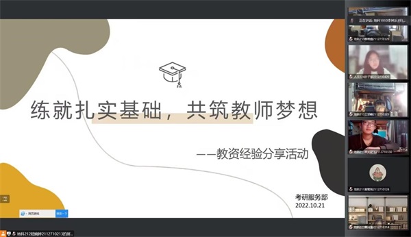 为帮助大一新生进一步认识教资考试,并对未来大学四年有更好的规划,10月21日晚,我院考研服务部于线上举办了以“练就扎实基础,共筑教师梦想”为主题的教资经验分享活动。