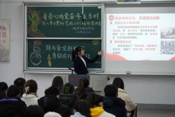 宣讲团以一段新闻展开,从“继往开来,全党守初心”“独辟蹊径,道路向光明”“守正创新,理论新境界”“科教兴国,青年勇担当”等四个方面生动阐述中国共产党的三件大事、中心任务、中国式现代化、马克思主义中国化时代化新境界和青年一代担负民族复兴重任的使命,并且用图片讲解、互动交流等方式激发同学们进一步思考,呼唤全体同学紧扣时代脉搏,为实现中华民族的伟大复兴不懈奋斗。