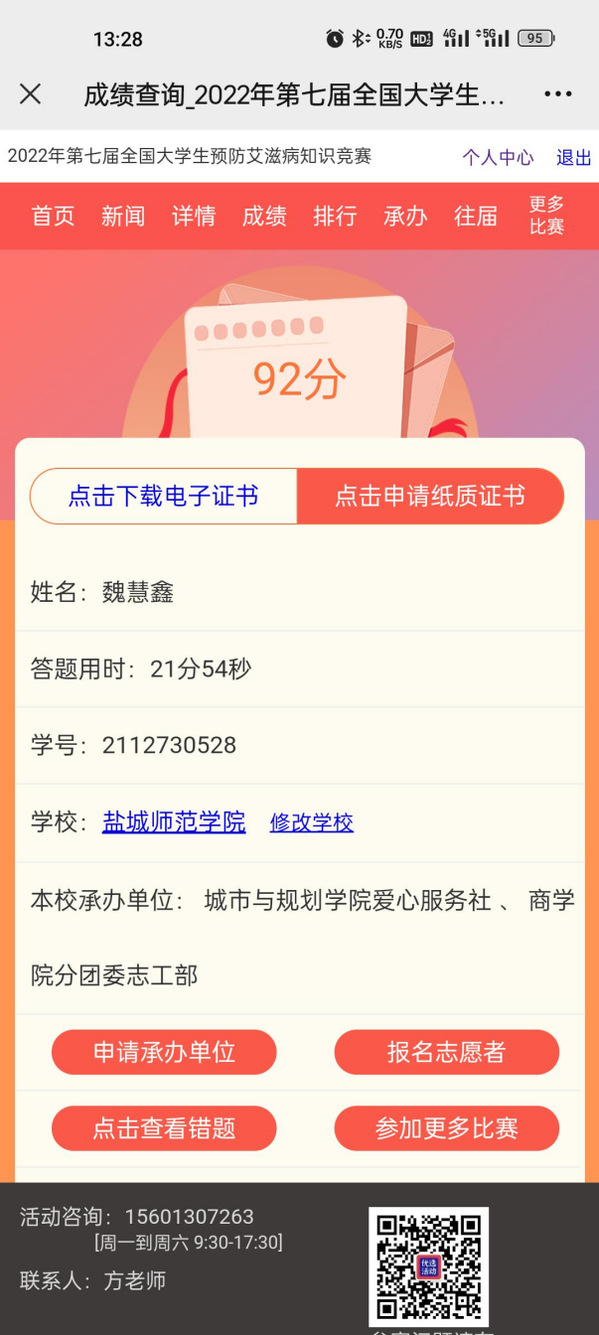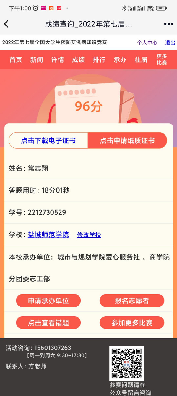 在活动前,同学们上网查阅相关知识,做好准备工作。在活动中,城市与规划学院20、21、22级的同学们积极参与线上答题,并且大多取得了不错的成绩。这一现象表明,大多数同学都具有了一定的防艾知识——这正体现了新时代通过互联网传播医疗卫生普及知识的良好效果。在活动后,许多同学表示,此次活动不仅提高了自己对艾滋病的认识,而且加强了自己对艾滋病防治的了解。