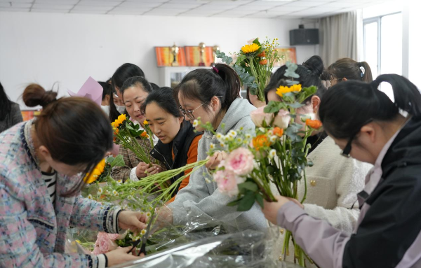 活动中,女老师们选择自己喜欢的花朵,亲手制作一份属于自己独一无二的花束,表达优雅情怀,用花感人,用花育人。