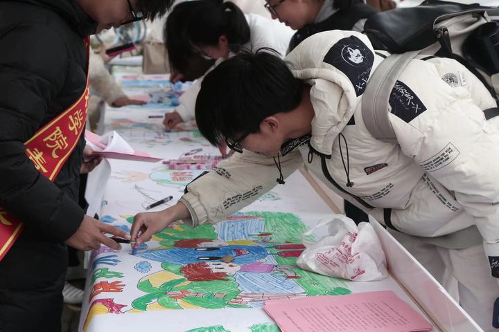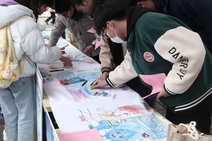活动中,同学们认真浏览展板,阅读宣传手册,从“节能降耗”“光瓶行动”“储蓄绿色”和“光盘行动”四个角度深入学习习近平总书记关于厉行节约的重要指示精神。同学们用不同图案的组合排列,元素的搭配堆叠,用画笔绘出心中的水,呈现十米环保长卷,表达对守护水环境的决心。地科222班刘明同学表示,“作为青年大学生,我们要将保护水资源的理念进一步落实到具体行动中,从“我”做起,从身边小事做起,以实际行动为实现“双碳”目标,建设美丽中国贡献自己的一份力量!”