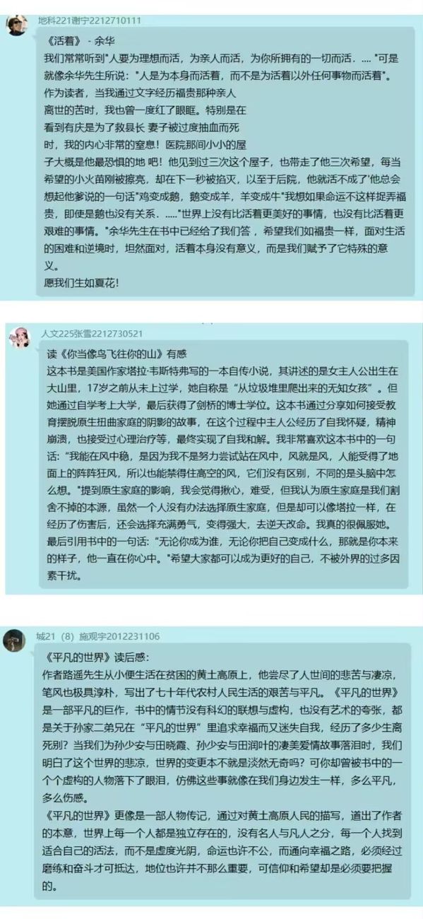 地科218班的陈忻瑷,地科212班的曹露尹,地科213班的史家铭,地科222班的束圣涛和人文224班的徐卓雅以PPT和视频的形式,用通俗易懂的语言和清晰的逻辑思维剖析了对他们来说有特殊意义的书籍,展示了他们对书籍主旨的思考和深入独到的理解。除了线下分享,在线上同学们也分享了自己喜欢的书籍。
