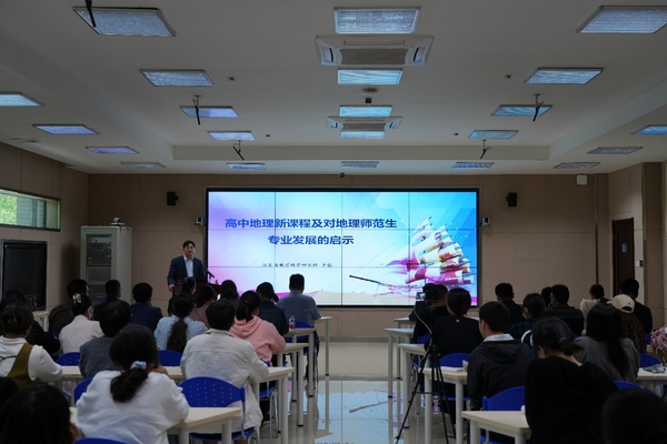 于蓉教授的报告围绕高中地理新课程中的学科核心素养展开,从提出的背景、内涵及表现、对地理师范学生专业发展的启示等方面进行进一步探究。于蓉教授明确指出地理核心素养是地理学科育人价值的集中体现,强调要采取地理学的视角,“重新认识”地理学的对象、使命目标以及研究特点,要在提升地理核心素养的同时充分彰显地理学科发展的实践性和时代性。最后,于蓉教授表示,同学们作为未来的地理教师,首先要夯实专业基础,加强专业学习,学习体悟地理学思想方法的精髓,做好职业规划,提升地理教学实践能力。盐城市地理教研员祝伟也指出地理核心素养及学科自信的重要性,向同学们传达了要始终保持学习热情的殷切希望。