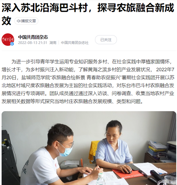 今年暑期,“农旅融合绘新景,青春助农促振兴”社会实践团积极响应团中央号召,紧紧围绕农旅融合、乡村振兴等主题,依托苏北农业农村现代化研究院和盐城城乡融合发展研究院双平台,发挥专业优势,立足青年实际,深入盐城市大丰区恒北村、东台市甘港村、东台市巴斗村、宿迁市刘圩村和淮安市白马湖村等乡村旅游重点镇村开展苏北地区村域农旅融合发展主题社会实践活动。实践团从区位、自然、人文背景等方面多角度多元化探究乡村振兴背景下村域尺度下农旅融合高质量发展的规律和模式。实践活动被《中国共青团杂志》今日头条号》《中国青年网》《交汇点》《现代快报》《盐城晚报》《盐阜大众报》等多家主流媒体的专题报道。