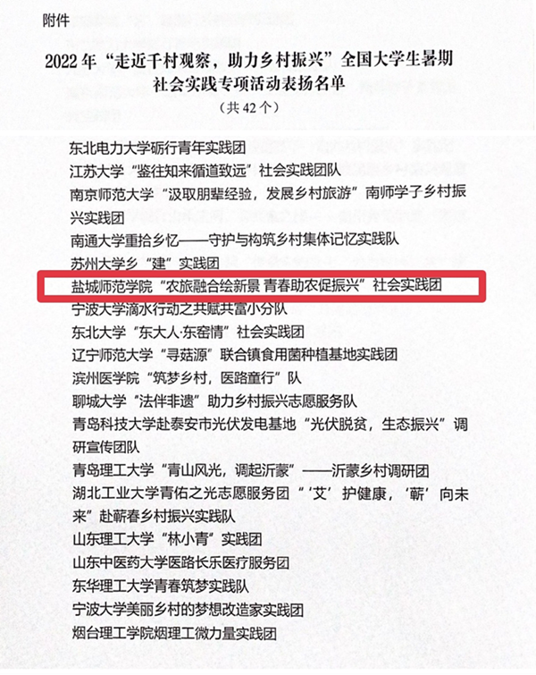 近日,由团中央青年发展部指导,中国乡村政策与实践研究院开展的“走近千村观察,助力乡村振兴”全国大学生暑期社会实践专项活动收官。我院“农旅融合绘新景,青春助农促振兴”社会实践团入选“走进千村观察,助力乡村振兴”全国大学暑期社会实践专项活动通报表扬名单(全国共42个)。