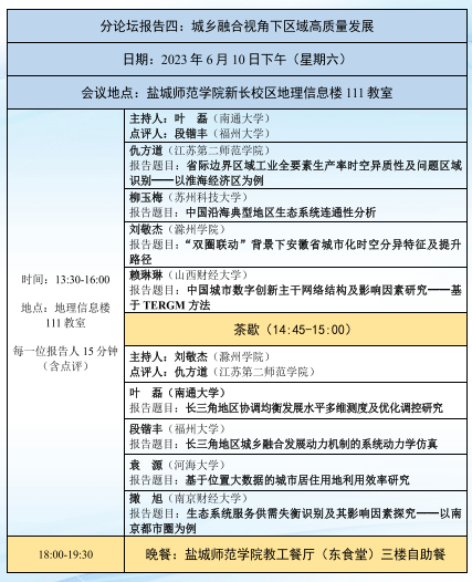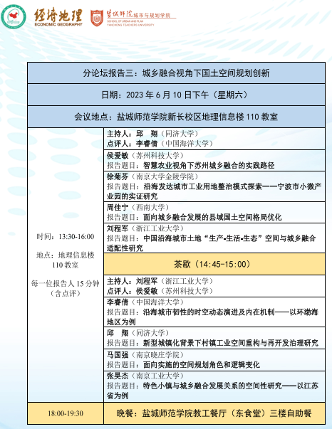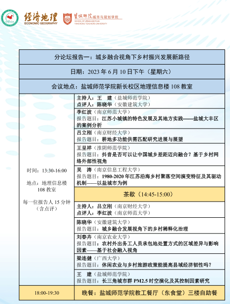 沿海地区城乡融合发展与国土空间治理专题研讨会“分会场一:城乡融合发展新思路和新模式”“分会场二:城乡融合视角下乡村振兴发展新路径” “分会场三:城乡融合视角下国土空间规划创新”“分会场四:城乡融合视角下区域高质量发展”于6月10日在江苏盐城顺利召开。在中国自然资源学会资源工程专业委员会和《经济地理》杂志社指导下,四个分会场由必发集团welcome欢迎光临城市与规划学院、苏北农业农村现代化研究院、盐城城乡融合发展研究院组织,共收到百余位来自全国各高校、科研院所的论文和报告,会议组织遴选了32场次学术报告,分别邀请王建、吕立刚、范业婷、单薇、邱翔、刘程军、叶磊、刘敬杰作为主持人,邀请陈晓华、李洪波、宋伟轩、刘传明、李睿倩、侯爱敏、段锴丰、仇方道对现场报告进行深入的点评和指导。本次分会场受到与会专家领导的广泛认可,受到中国自然资源学会资源工程专业委员会和《经济地理》杂志社的充分肯定。