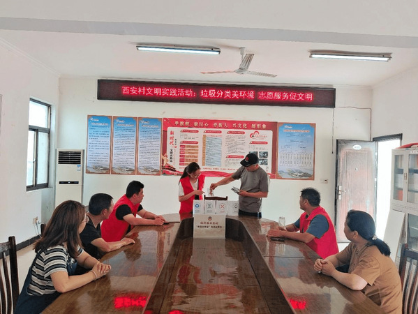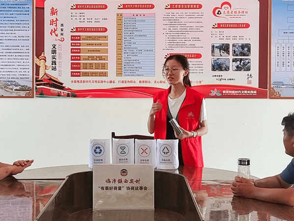活动中,团队成员发放垃圾分类知识宣传单、主题宣讲等形式向西安村的村民们讲述垃圾分类的现状、坚持做好垃圾分类的必要性,向村民并详细讲解如何进行垃圾分类、如何正确进行投放,一起深刻了解垃圾分类的重要意义。