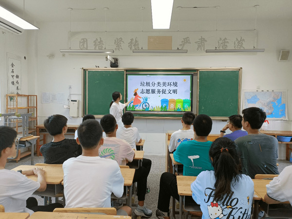 垃圾分类是推动环境美化和社会文明的重要举措之一,为引导中小学生养成垃圾分类的良好习惯,8月1日,我院“垃圾分类美环境,志愿服务促文明”实践团赴盐城市阜宁县镇张庄初级中学开展第四阶段实践活动。