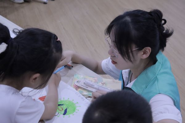 团队特邀南通市海门区人民医院感染科副主任医师王永兵医生给同学们上一堂“防治结核”科普小课堂。医护人员通过结合典型病例、形象的图片资料和现场生动的演示向大家讲述结核病的相关知识,带领大家规范学习七步洗手法,传递人人参与、共享健康的防治结核理念,积极培养健康文明的生活方式。“爱的传递”游戏互动环节中,在团队成员的引导下,同学们从多个角度表达出自己对防治结核的理解与认识,为少年儿童的健康成长筑起了一道精神“防护林”。