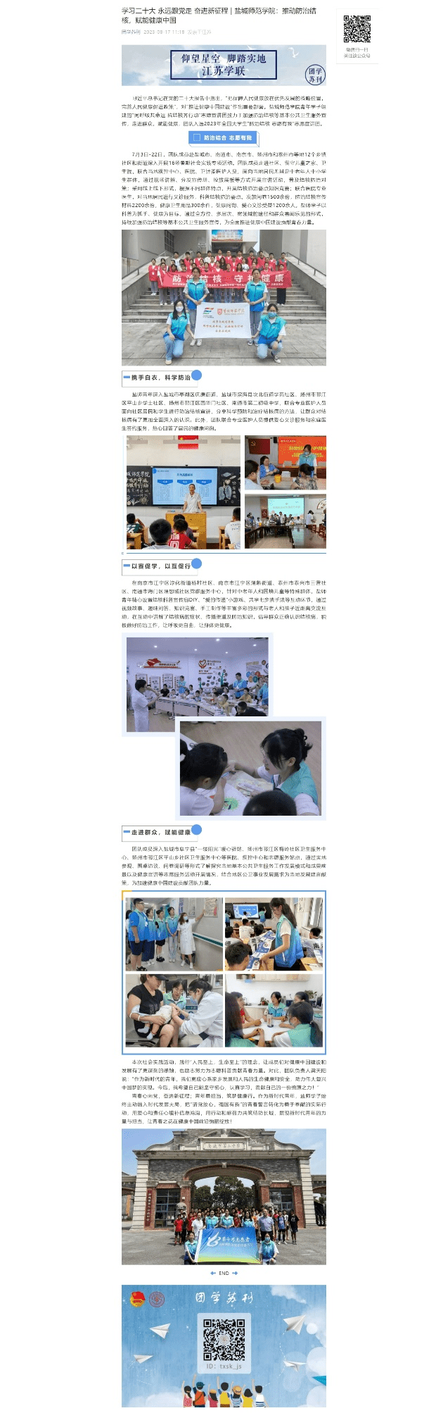 8月17日,《团学苏刊》报道了城市与规划学院“同呼吸共命运 抗结核齐行动”实践团的暑期社会实践活动。