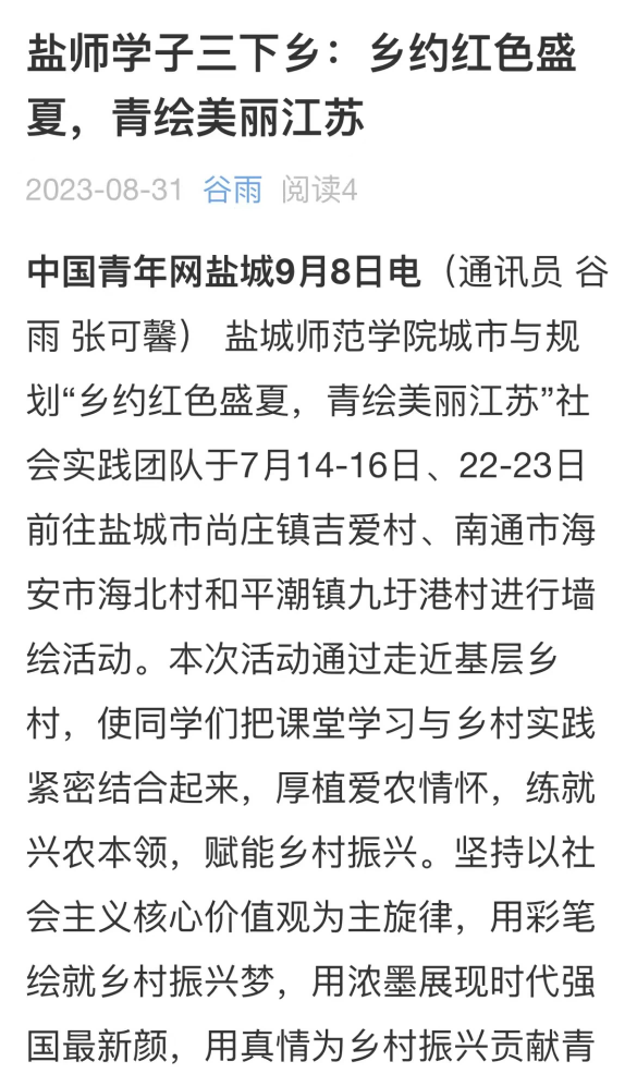 9月8日,中国青年网(中青校园)报道了城市与规划学院乡约红色盛夏,青绘美丽江苏”社会实践团队的暑期社会实践活动。