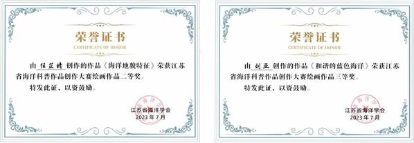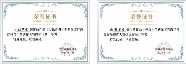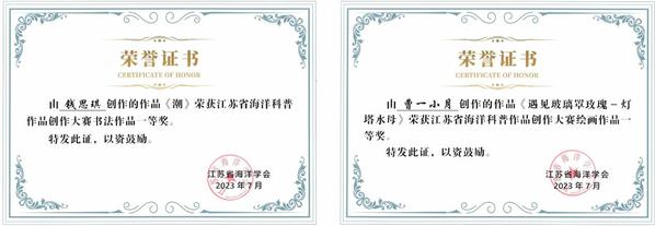 2023年6月26日,由江苏省海洋学会主办的江苏省海洋科普作品创作大赛落下帷幕。我院在本次大赛中喜获佳绩,在摄影、书法、绘画等三大类别中均获得获项,共获一等奖3项、二等奖1项、三等奖2项。