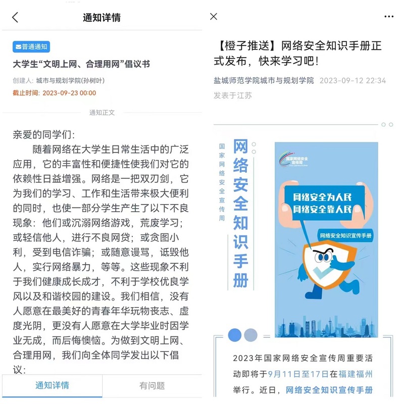 强化宣传引导,营造浓厚氛围。学院积极创新传播形式,充分利用学院微信公众号等新媒体,宣传网络安全知识;同时通过今日校园等媒体平台向同学们发起网络安全倡议书,提醒同学们诚信守法,自律上网,依法上网,理性上网,做网络文明的捍卫者,做营造新风的自律者。
