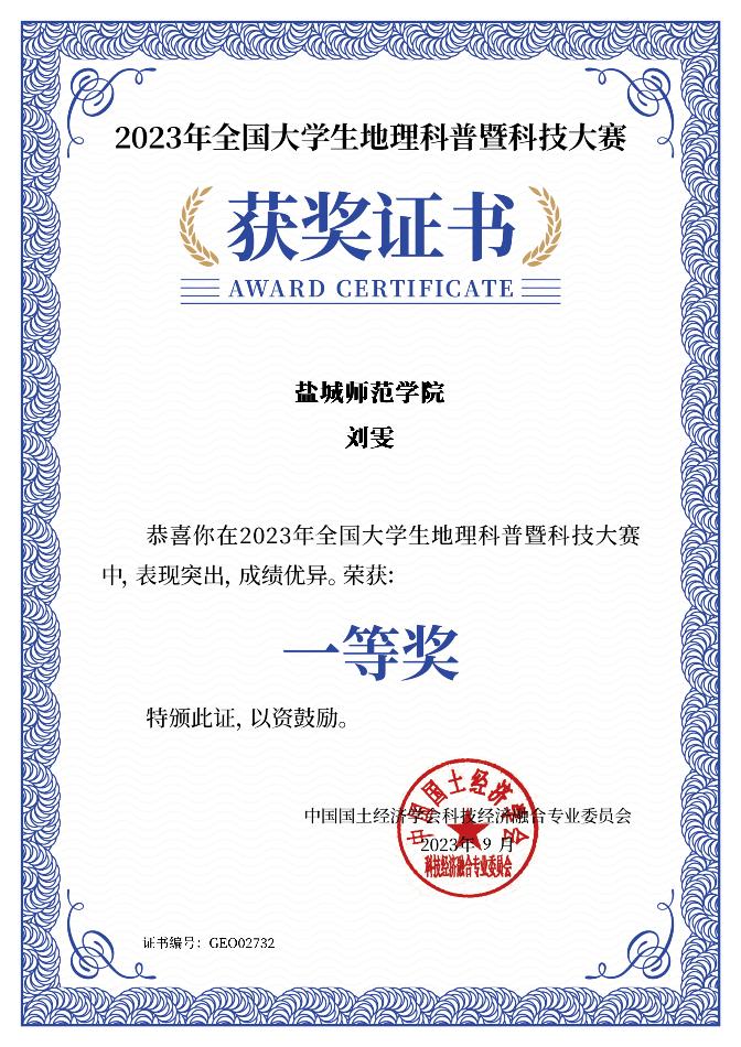 9月25日,由中国国土经济学会主办的2023年全国大学生地理科普暨科技大赛落下帷幕。我院在本次大赛中喜获佳绩,参赛选手荣获一等奖。
