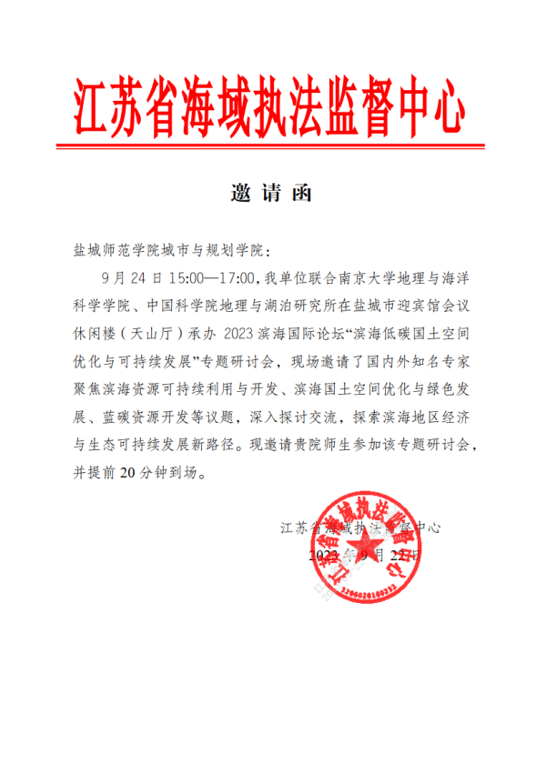 9月24号下午,2023年全球滨海论坛“滨海低碳国土空间优化与可持续发展”专题研讨会在盐城迎宾馆召开。研讨会由南京大学地理与海洋科学学院、江苏省海域执法监督中心、中国科学院南京地理与湖泊研究所共同主办,自然资源部碳中和与国土空间优化重点实验室、南京大学盐城环保技术与工程研究院具体承办。来自国际地理联合会、莫斯科罗蒙诺索夫国立大学、南京大学、南京审计大学、南京师范大学、中国科学院南京地理与湖泊研究所、自然资源部第一海洋研究所、必发集团welcome欢迎光临等单位的专家学者齐聚一堂,共探滨海地区绿色低碳发展之路。受会议主办发邀请,我院院长李传武、学院教师团队及学生代表参加本次研讨会。