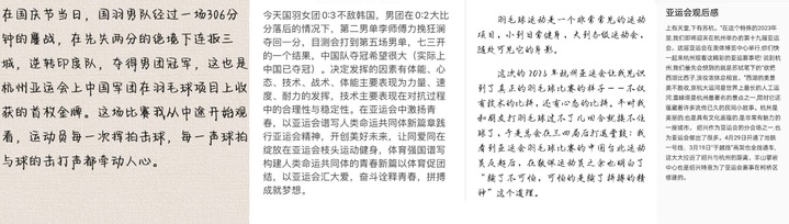 除了运动打卡这个主线任务,本次活动还有一个支线任务——观看亚运会羽毛球比赛。观看结束后,近50位同学位同学写下了自己的感悟。人文224班的徐卓雅同学这样写道:“我看到亚运会羽毛球比赛的中国台北运动员反超后,在敬佩运动员之余也明白了‘输了不可怕,可怕的是输了拼搏的精神’这个道理。”地科231班的沈雨欣同学表示:“体育运动的魅力在于,它磨练人顽强的意志和坚韧的品质,这对于每一个人都是终身受益的!坚持运动,致敬每一个为国家拼搏的运动员!”