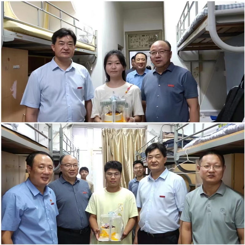 院领导分别来到学生公寓2号楼和4号楼,与同学们进行亲切的交谈,详细询问同学们的入住情况和适应情况,耐心细致地回答学生的问题,并希望同学们尽快适应新的学习生活环境,遇到任何困难和问题及时向辅导员反应,鼓励他们树立正确的人生观和价值观,坚定理想信念,做好生涯规划,不断充实自己。同时为两名当天过生日的学生送上生日祝福,并赠送了生日蛋糕。同学们纷纷表示,感谢学院领导及老师们的关怀,会尽快调整状态,融入学院这个大家庭,以积极进取的心态迎接大学生活,不负学院、家长、老师寄予的殷切期望。
