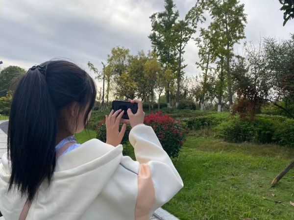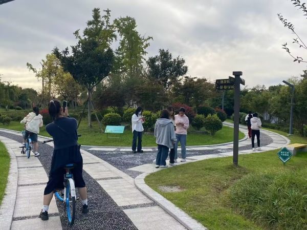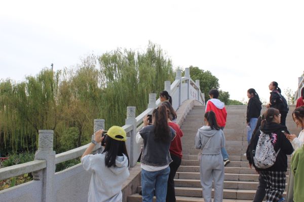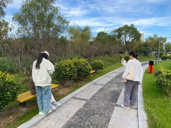 活动过程中,同学们在地科222班任芷晴同学的带领下来到迎春公园。自由活动期间,有的同学顺着鹅卵石路一路往里探索,有的同学选择在秋景桥上欣赏岸边的垂杨柳,还有的同学在水上小亭中抓拍空中的飞鸟。不同的是地点和景色,相同的是大家都在记录自己所感受到的秋天。人文237班的黄薪荀同学表示:“这次活动,让我们在忙碌的学习生活中享受到大自然给予我们的一份美丽的礼物——秋天,给我们的内心带来宁静与安逸,身体和心理都得到了放松。”