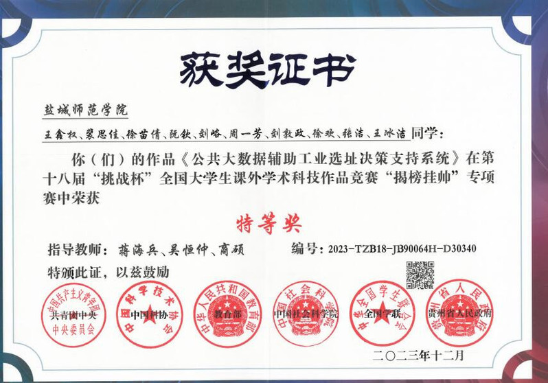 2023年9月16日至17日,第十八届“挑战杯”全国大学生课外学术科技作品竞赛“揭榜挂帅”专项赛终审决赛在贵州大学举办,我院选报的《公共大数据辅助工业选址决策支持系统》(指导教师:蒋海兵、吴恒仲、商硕)荣获全国特等奖。近日,团队收到了这份沉甸甸的获奖证书。