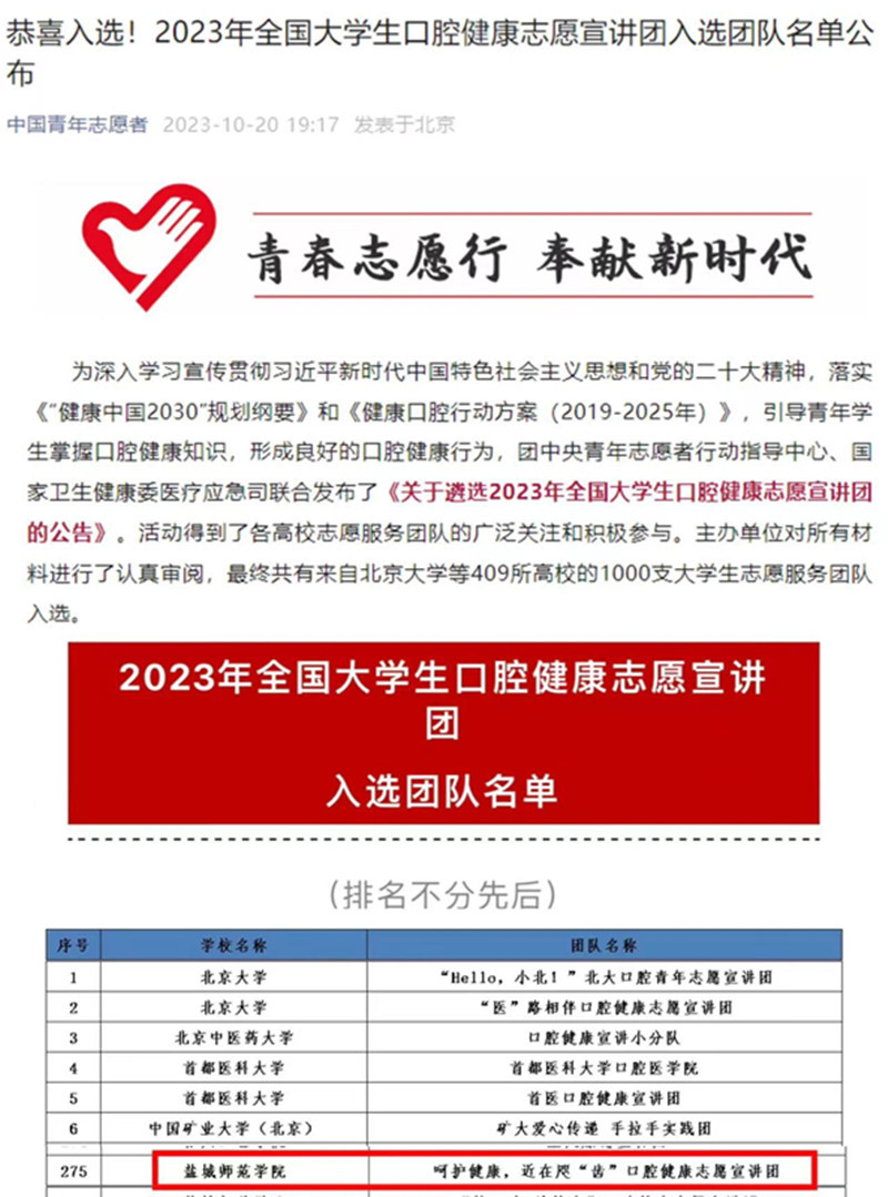 近日,由团中央青年志愿者行动指导中心、国家卫生健康委医疗应急司主办,中南大学湘雅口腔医院、中国青年志愿者协会秘书处承办的2023年全国大学生口腔志愿宣讲团遴选活动圆满落幕,遴选出来自409所高校的1000支大学生志愿服务团队,我院“呵护健康,近在咫‘齿’”志愿宣讲团成功入选。