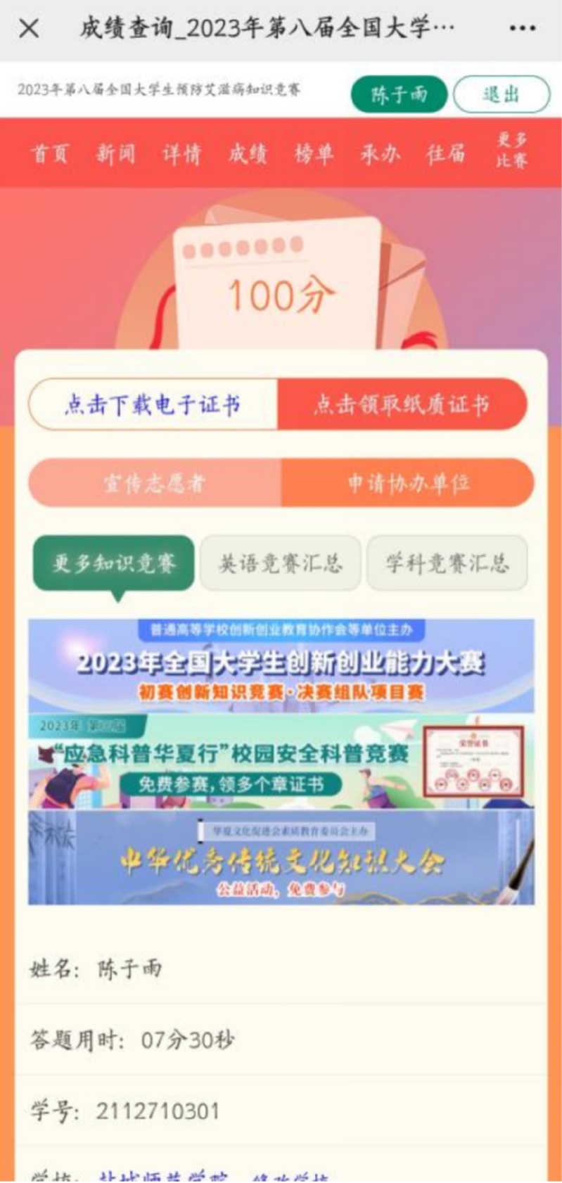 本次竞赛活动通过线上答题的方式成功举办,使同学们更深入了解艾滋病知识,正视艾滋病问题,减少对艾滋病患者的歧视,关注艾滋病相关弱势群体,增强自我保护意识。(文:袁宇凡 审核老师:杨珊珊)