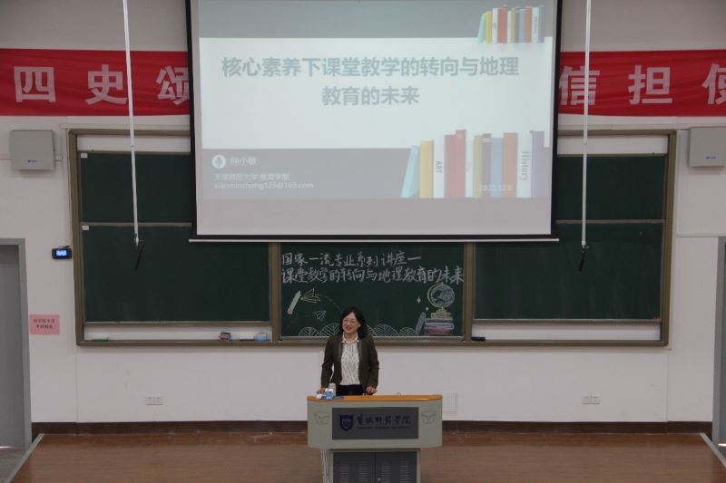 12月6日下午,天津师范大学教育学部副部长仲小敏教授受邀到我院作“核心素养下课堂教学的转向与地理教育的未来”主题学术报告。报告会由我院院长李传武主持,学院副院长朱天明、全体系主任、教师代表、盐城康居路初级中学地理骨干教师及学院地理科学专业学生200余人参加报告会。