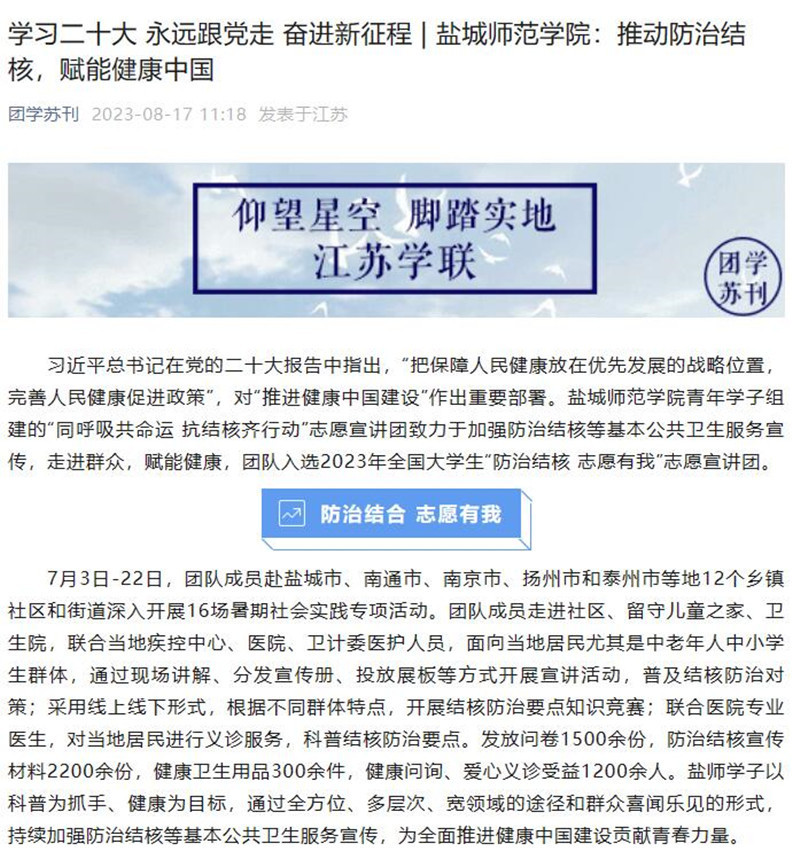 据悉,团队入选团中央2023年全国大学生“防治结核 志愿有我”志愿宣讲团,中国共青团杂志、江苏省学联官微《团学苏刊》《中国青年网》《盐阜大众报》《南通发布》等20余家主流媒体对实践活动进行了专题报道。