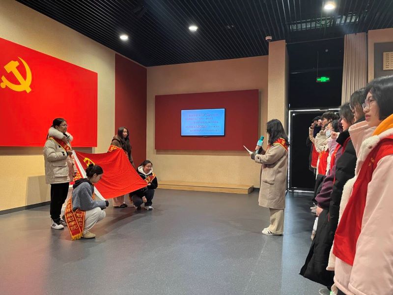青年志愿者们在馆内重温入团誓言,面对中国共产主义青年团团旗,许下新时代团员青年“请党放心,强国有我”的青春誓言和庄严承诺。