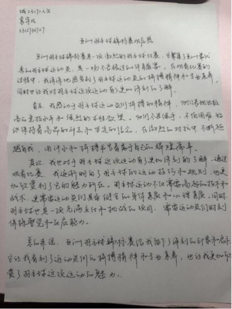此次活动通过线上的形式开展,共102人参与打卡,活动内容分为主线和支线,主线为同学们通过Keep APP搜索羽毛球运动训练的相关视频,打卡并提交相关照片和截图。此次活动共收集到700多张照片,展现了同学们对此次活动的热情;支线为同学们通过观看亚洲羽毛球锦标赛,写下自己的感悟并附上观看的照片,每个人观看完比赛都有了不同的收获。地科233刘洋同学写道:“在观看中,我感受到了羽毛球运动的魅力所在。它不仅需要运动员具备出色的身体素质和技术水平,还需要具备敏锐的反应能力和战术意识。同时,羽毛球运动也是一项团队运动,需要运动员们相互协作、默契配合,才能取得好成绩。”