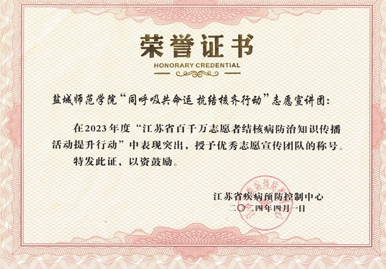 近日,2023年度百千万志愿者结核病防治知识传播活动提升行动推选结果揭晓。我校城市与规划学院“同呼吸共命运 抗结核齐行动”志愿宣讲团获全国结核病防治知识传播活动优秀志愿宣传团队、江苏省结核病防治知识传播活动优秀志愿宣传团队,这是团队继去年入选团中央全国大学生“防治结核 志愿有我”志愿宣讲团,获评全国大学生暑期实践团队TOP100、教育部中国大学生在线“大我青春”暑期社会实践成果征集展示活动实践风采类优秀作品后再获殊荣。