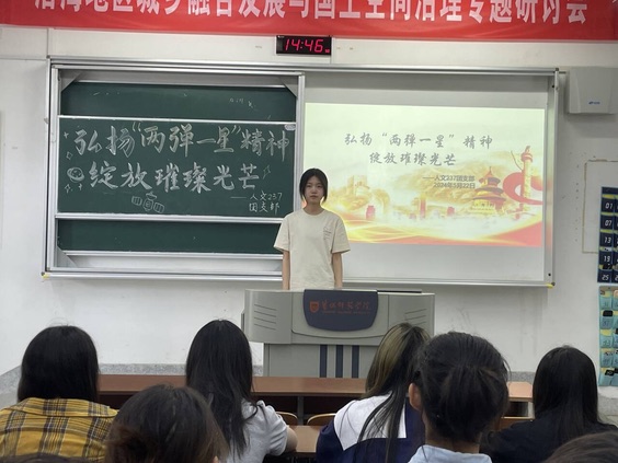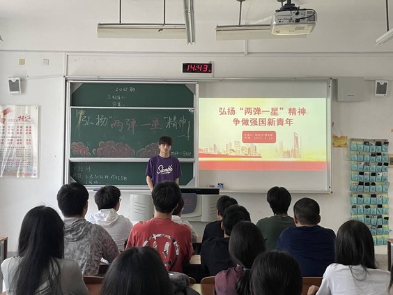 活动中,各班团支部组织同学们观看《“两弹一星”元勋——钱学森》,帮助同学们了解了中国航空航天和科学领域的历史和成就,进而强化使命担当,勇于创新突破。活动期间,各班团支部结合自身情况,针对“新时代青年如何在当代践行‘两弹一星’精神”进行研讨交流,其中地科231班陈思璇同学表示:“作为新时代青年,我应该深刻了解“两弹一星”精神的内涵,砥砺奋进,将个人梦想融入国家发展大局。同时也要刻苦学习科技知识,提高创新能力。发扬艰苦奋斗的精神,面对困难敢于迎难而上,勇于攻坚克难,我们应该团结起来,努力成为新时代建设的巨大合力!”