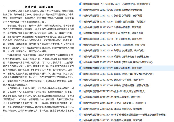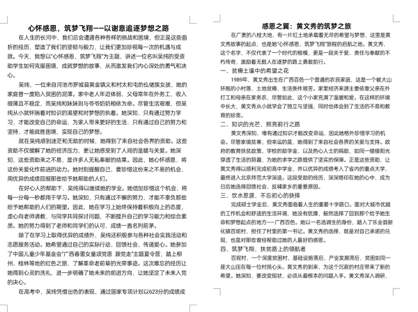 活动一经启动,便在全院学生当中激起热烈反响。同学们纷纷以饱满的热情投入创作,用生动的文字书写成长历程。此次征文评选收集到众多的优秀作品,或以大眼睛女孩苏明娟的事迹为航标,指引自己追逐梦想的航程;或以扶贫之花黄文秀的事例为蓝本,描绘自己人生的壮丽画卷。“心怀感恩,筑梦飞翔”的口号不仅深入人心,更在同学们的实践活动中得到了充分体现。地科233班王心怡表示,通过参与这次征文活动,我更加深刻地理解到感恩与梦想的力量,也感受到我校资助工作的精准与全面性。