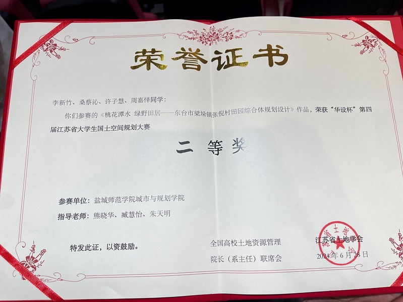 6月28日,“华设杯”第四届江苏省大学生国土空间规划大赛决赛在南京大学举行。我院参赛的作品《桃花潭水 绿野田居》(参赛成员:李新竹、桑蔡沁、许子慧、周嘉怿;指导教师:熊晓华、臧慧怡、朱天明)荣获二等奖。