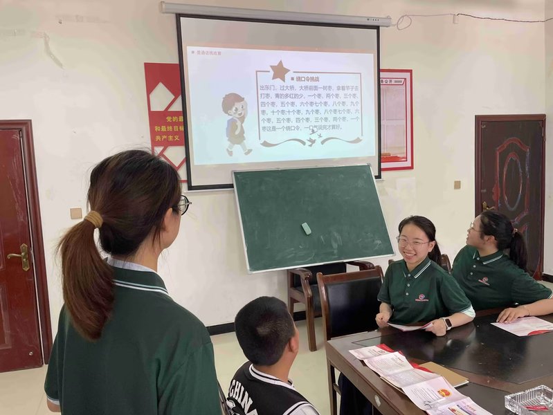 实践团成员向酉阳团县委对接“三下乡”的工作人员开展专项访问,从地方角度了解乡村振兴战略实施情况和国家通用语言文字普及情况,工作人员介绍道,由于地理阻隔且多少数民族,老一辈居民识字率低、讲话口音重,当地缺乏普通话使用语境,在宣传重点帮扶政策、推广现代农业技术等行动中存在“听不懂、说不清、难沟通”的问题,乡村振兴战略实施存在现实堵点。随后,实践团成员向团县委工作人员进行“推普助力乡村振兴”专题介绍,宣传推广普通话的重要性,讲解普通话在沟通交流、业务合作等方面的优势,鼓励在日后的工作中积极宣传普通话,提高沟通效率。