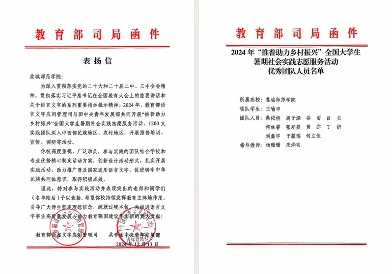 近日,由教育部语言文字应用管理司、共青团中央青年发展部联合开展的2024年“推普助力乡村振兴”全国大学生暑期社会实践志愿服务活动评选结果揭晓,我院“推普润乡心”社会实践团从全国1200支团队中脱颖而出,获评优秀团队,教育部语言文字应用管理司和共青团中央青年发展部来信表扬。信中指出我院高度重视、广泛动员,精心制定活动方案,创新设计活动形式,扎实开展实践活动,助力推广普及国家通用语言文字,促进铸牢中华民族共同体意识,充分肯定了我院在推普暑期实践中的突出表现。(文:朱烨明 审核:郝保成)