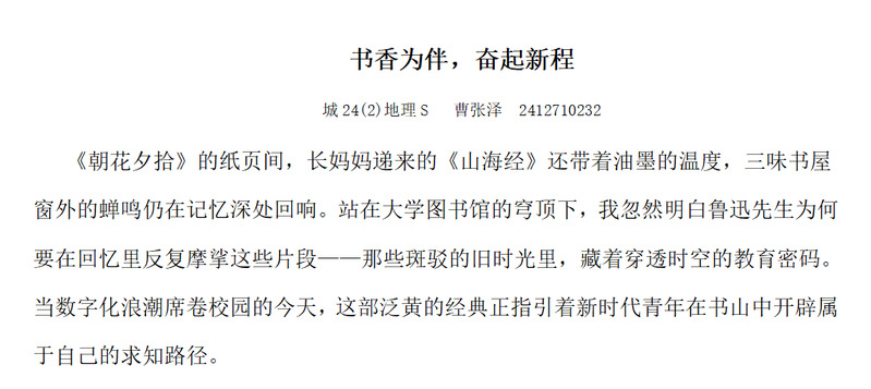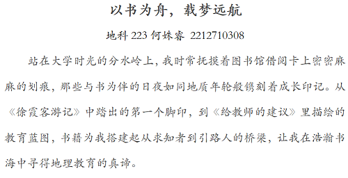 活动一经推出,便在校园内掀起了一股创作热潮。同学们纷纷拿起笔,以文字为载体,尽情抒发内心深处的缕缕情思,踊跃分享自己在阅读世界里的独特感悟,生动展现出阅读为人生带来的深刻启迪。地科223 班的何姝睿同学在其佳作《以书为舟,载梦远航》中深情写道:“永远保持对知识的热望,对真理的虔诚,对生命的敬畏。”寥寥数语,尽显其在阅读中收获的宝贵人生启示,字里行间满是对知识与生命的尊崇。地科 242 班的曹张泽同学则在作品《书香作伴,奋起新程》里有感而发:“知识的价值不在于堆砌,而在点燃他人眼中的星火。” 他透过《朝花夕拾》的字里行间,敏锐捕捉到鲁迅先生创作时的细腻思绪与深远意图,深刻领悟经典文学作品的魅力与价值。