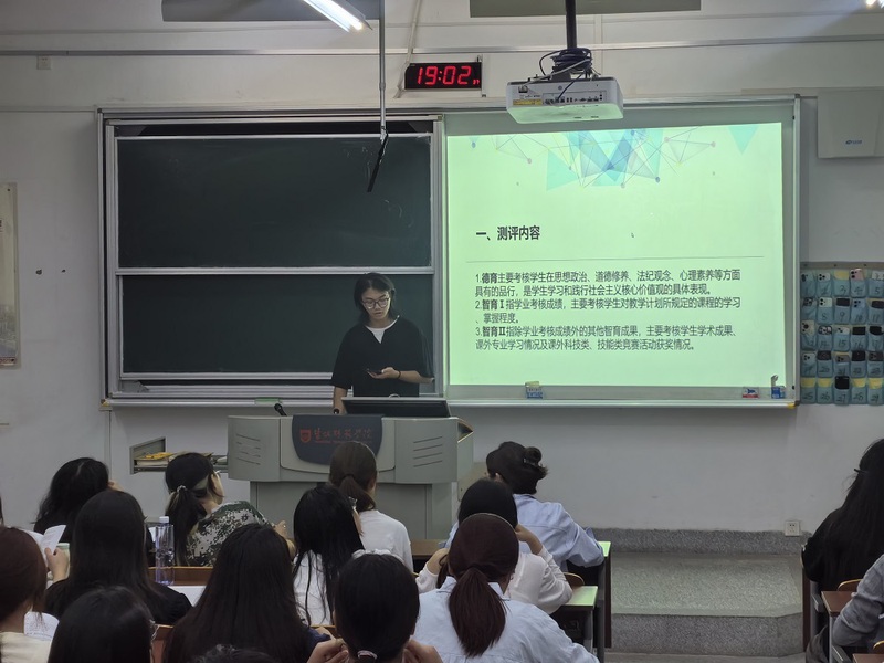 本次主要学习《学生素质综合测评办法》《学生奖学金评选办法》《“三好学生”“优秀学生干部”评选办法》《优秀毕业生评选办法》等相关评奖制度。主讲人领学了新修订的《学生素质综合测评办法》,并对其中的德育素质,智育素质,体育素质,美育素质,劳动素质五个部分的详细内容以及加减分规定作了解读,这五个方面的素质是人才培养的重要环节,旨在通过树立目标、明确导向,促进学生全面发展和健康成才。同时,通过黑板画线,假设举例对奖学全评定工作进行了阐述,让新生们理解了四项奖学金的获得要求,明确了学业与综测在大学的重要性。最后,主讲人对新生提出的疑问进行了解释,提醒大家要兼顾学习与活动,做到全面发展,不断提升自己的水平和能力。