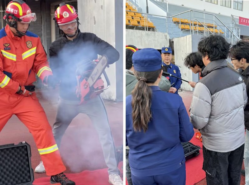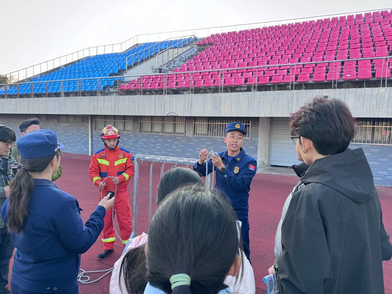 互动展示活动现场,“偶遇火焰蓝”消防宣传区率先吸引了师生目光:经开区消防救援大队的指战员们逐一展示灭火器、消防水带等专业器材,用通俗易懂的语言讲解器材原理、使用方法及日常维护要点;圈灭火器互动游戏前,同学们排起长队,在趣味挑战中熟记灭火器类型与适用场景;结绳挑战区里,消防员现场教学逃生结绳技巧,大家跟着示范反复练习,将自救技能牢牢掌握。