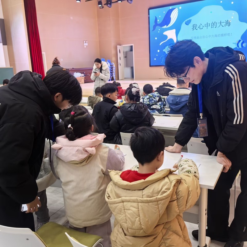 活动伊始,志愿者们借助精心制作的PPT,通过图文并茂的展示与趣味问答,向孩子们系统讲解了海豚、海龟、珊瑚等海洋生物的习性与特点。现场气氛热烈,孩子们积极举手互动,在轻松愉快的氛围中汲取了丰富的海洋知识。在知识讲解的基础上,志愿者们引导孩子们结合科普内容与个人想象,动手创作自己心目中的海底世界。孩子们以画笔为媒,充分发挥奇思妙想,将对海洋的认知与向往倾注于画纸之上。活动尾声,志愿者们与孩子们以画会友,将作品作为纪念。